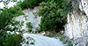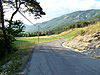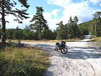 Im weiteren Verlauf geht die Strecke durch schön dichten und meist aus Nadelbäumen bestehenden Wald, um einen herum ist es überall grün. Die Straße schlängelt sich mitunter sehr steil den Berg hinauf, durchzogen von tiefen querverlaufenden Löchern und Steinansamlungen. Wer einen nett gewalzten Feldweg erwartet hat, wird hier von vorn bis hinten entäuscht. Das Bild links wurde 2 Kilometer hinter der Einfahrt aufgenommen und zeigt der Blick zurück. Die Tatsache, das keine Himmel mit im Bild ist, dürfte ein Hinweis auf das starke Gefälle sein.