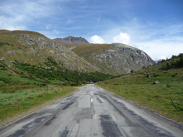 Die Südseite des Col de l'Iseran. Im Bild ist die letzte Gerade zu sehen, die man (nach fast 20 Kilometern dröger Strecke) zu bewältigen hat. In der Bildmitte, rechts unterhalb des grauen Gipfels, kommen die lange ersehnten Kehren.