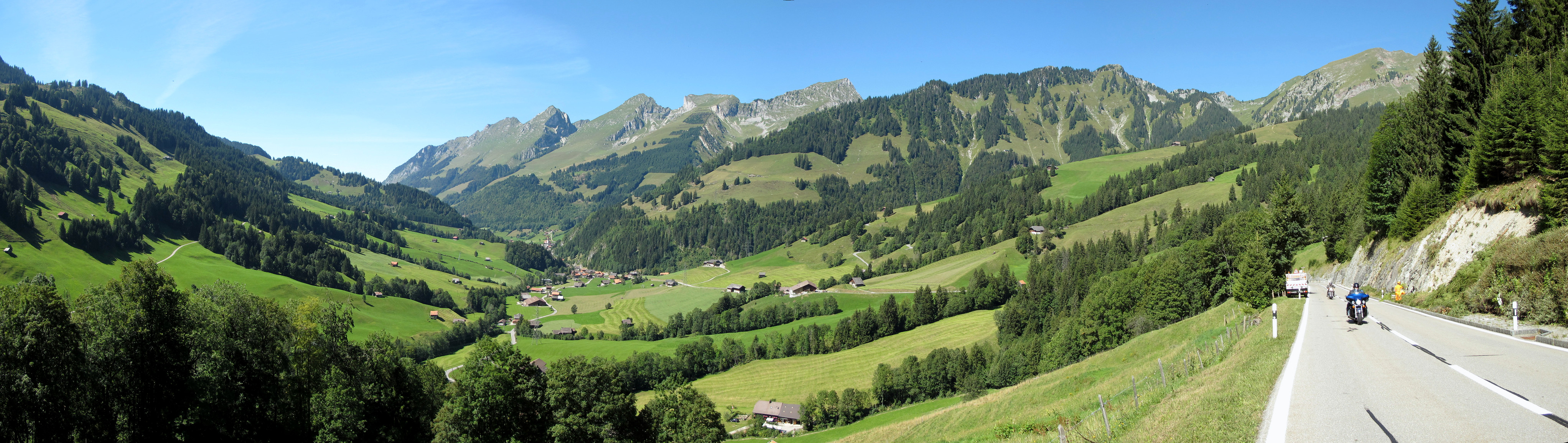 Auf der gesamten Westrampe ist häufig der Blick ins Tal frei. Dieses Panoramabild wurde wenige Kilometer unterhalb der Passhöhe aufgenommen.