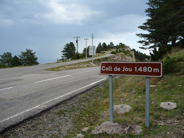 Der Blick geht nach Süden, die beiden großen Parkplätze und die Kreuzung liegen im Rücken des Betrachters. Der kleine Weg links im Bild ist ein Wanderpfad, der auf den 1590 Meter hohen Creu de Codo führt.