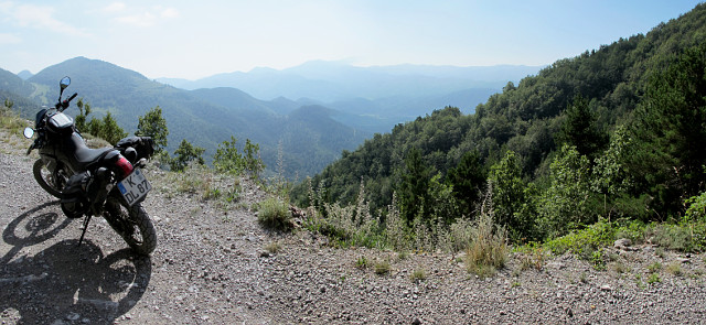 Schöner Blick in die Landschaft, durch die auf der Südrampe gefahren wird. In Fahrtrichtung ist die Kreuzung nicht mehr weit entfernt, an der aus dem Schotter-Belag letztendlich ein schmaler Asphaltweg wird.