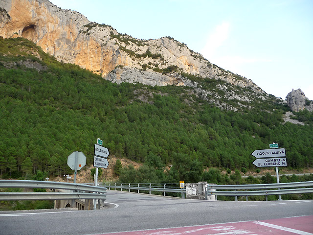 Blick auf die Einfahrt zur Jou-Westrampe, aufgenommen von der Hauptstraße C-14 zwischen den Orten Coll de Nargo und Organyà. An dieser Stelle ist der Pass nicht ausgeschildert, somit muss man sich hier nach dem Ort Cambrils richten.