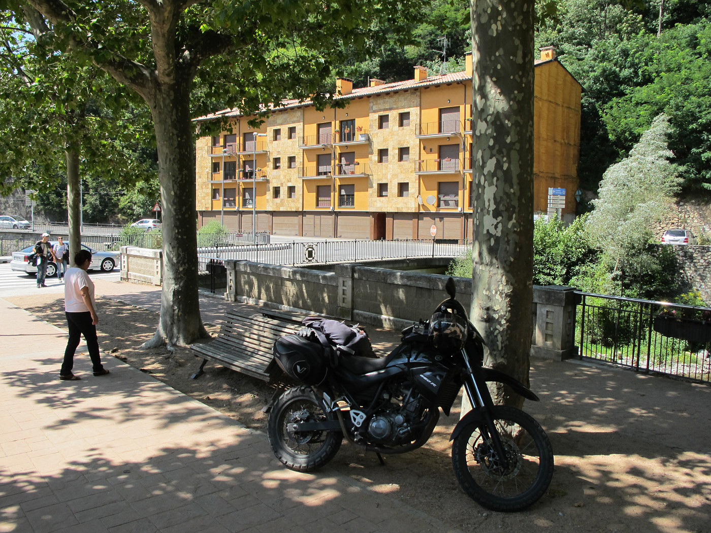 Canya - Westseite unten Blick auf Ribes de FreserDie Westrampe beginnt in Ribes de Freser, gleich an einem auffälligen und freistehenden Wohnhaus mit gelblicher Außenfassade, das sogar aus der Ferne gesehen werden kann. Der Fluß wird überquert, gleich dahinter befindet sich linke Hand eine nette Rastmöglichkeit.