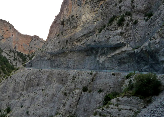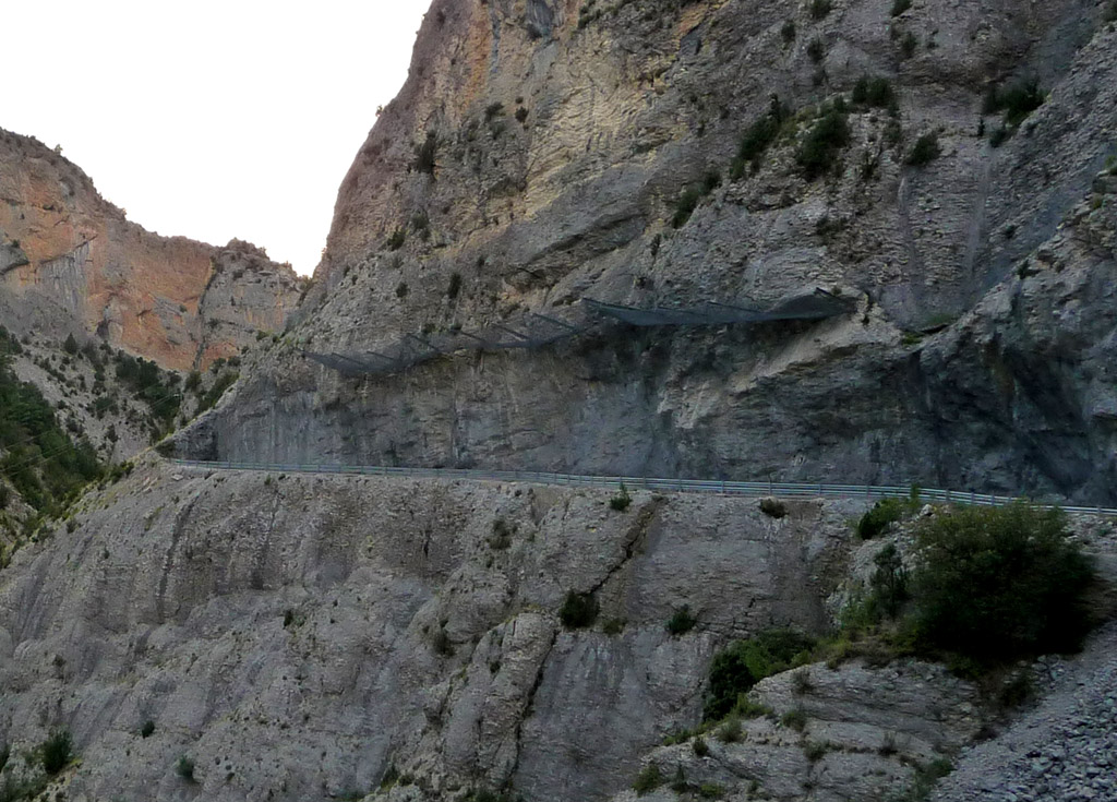 Zwischen dem Anfang der Westrampe und dem Ort Alinyà sind hin und wieder solche Schutzgitter über der Straße angebracht, damit der Steinschlag nicht zum Helmbelastungstest wird.