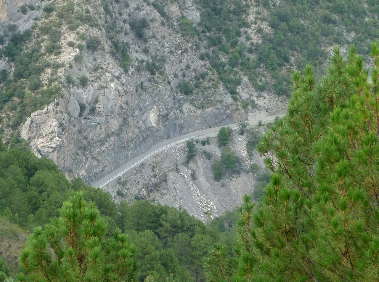 Knapp unter dem Ort Alinyà ist die Straße hart in den Fels geschlagen worden. Ein Teilstück davon kann man schon von weitem sehen, wenn man sich von oben dem Ort nähert.