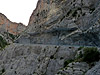 Schon vor Alinyà sieht man von der Straße aus, das der letzte Abschnitt wieder ähnlich grau und wüstenartig wird. Von oben blickt man auf die kommenden Kilometer und kann gut erkennen, wie sich das hellere Asphaltband vom unebeneren Felsen abhebt, und auf ihrem Weg gleich mehrere Tunnelanlagen durchquert. Wenn ich mich recht entsinne, ist dieser Bereich auch der mit der schmalsten Fahrbahnbreite, die gerade an den gefährlichen Stellen und innerhalb der Tunnel bis auf eine Spur zusammenschrumpft. An manchen Stellen wurde auf den Bau von Galerien verzichtet, und die Straße wurde nur mit stabilen (?) Auffanggittern vor Herabfallendem geschützt.