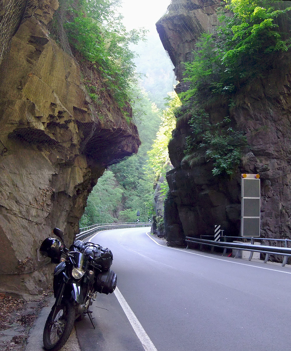 Beginnt man die Überquerung des Karerpass im Westen, fährt man zuerst durch lange Tunnelanlagen. Kommt man aus diesen heraus, führt die Straße durch eine ansehnliche Schlucht im Eggental, die gleich zu Anfang am beeindruckendsten ist.