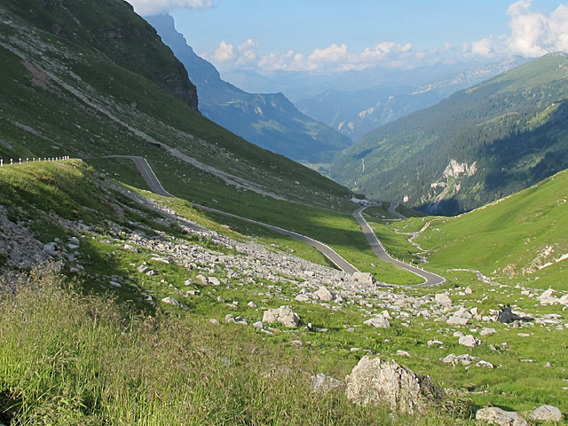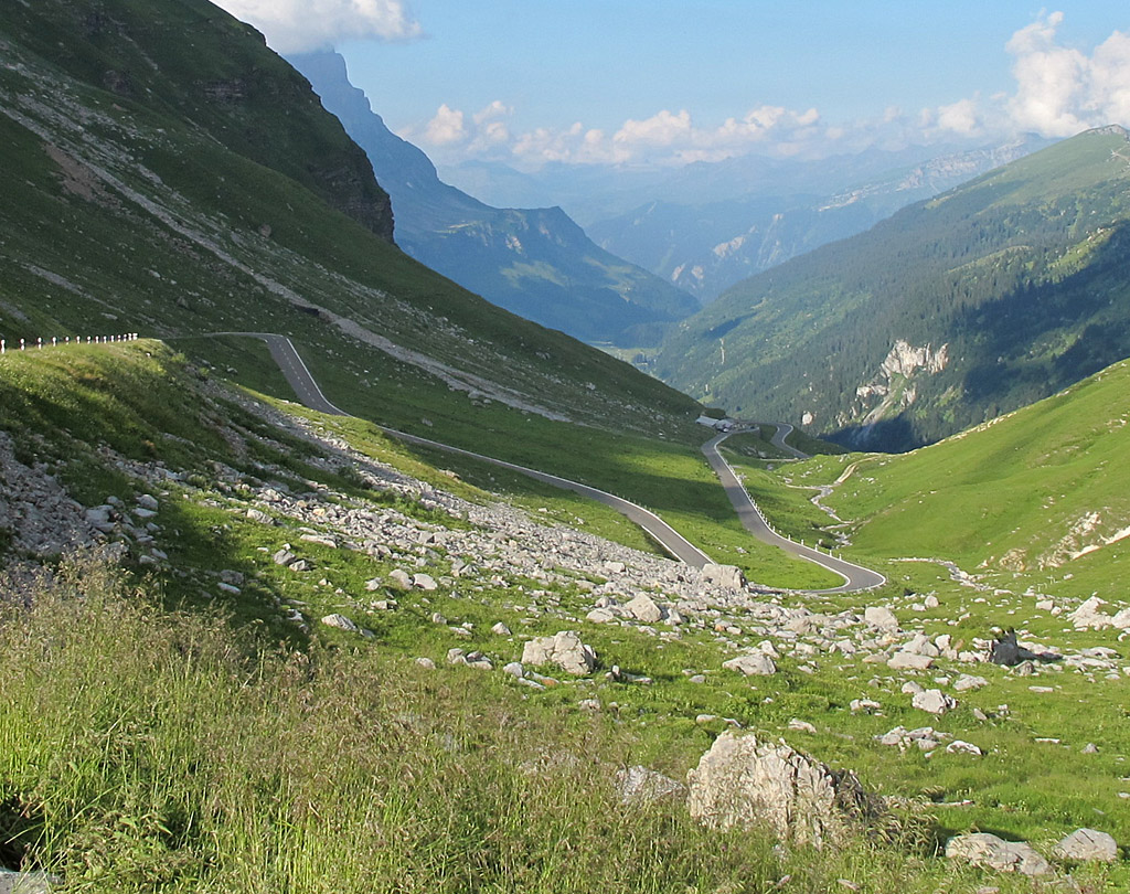 Wenige Fahrmeter unterhalb der Passhöhe empfangen einen gleich mehrere Kehren.