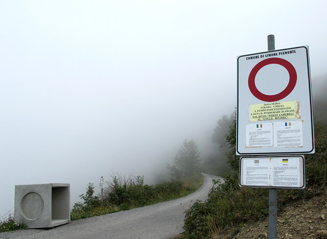 Die westliche Einfahrt auf die LGKS-Nordost-Schleife(i) ist einen Kilometer unterhalb der Tende(i)-Passhöhe zu finden. Neben einem gut besuchten Restaurant mit vollgestelltem Parkplatz führen zwei Strecken in die Höhe, von denen die per Verbotsschild markierte die für Enduros freigegebene Ligurische Grenzkammstraße ist.