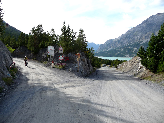 Im Hintergrund ist der Lago di Cancano zu sehen, die Straße rechts führt direkt hinunter zu seiner Staumauer. Die etwas schmalere Schotterpiste links führt südlich am See vorbei weiter zum Lago di San Giacomo di Fraele.