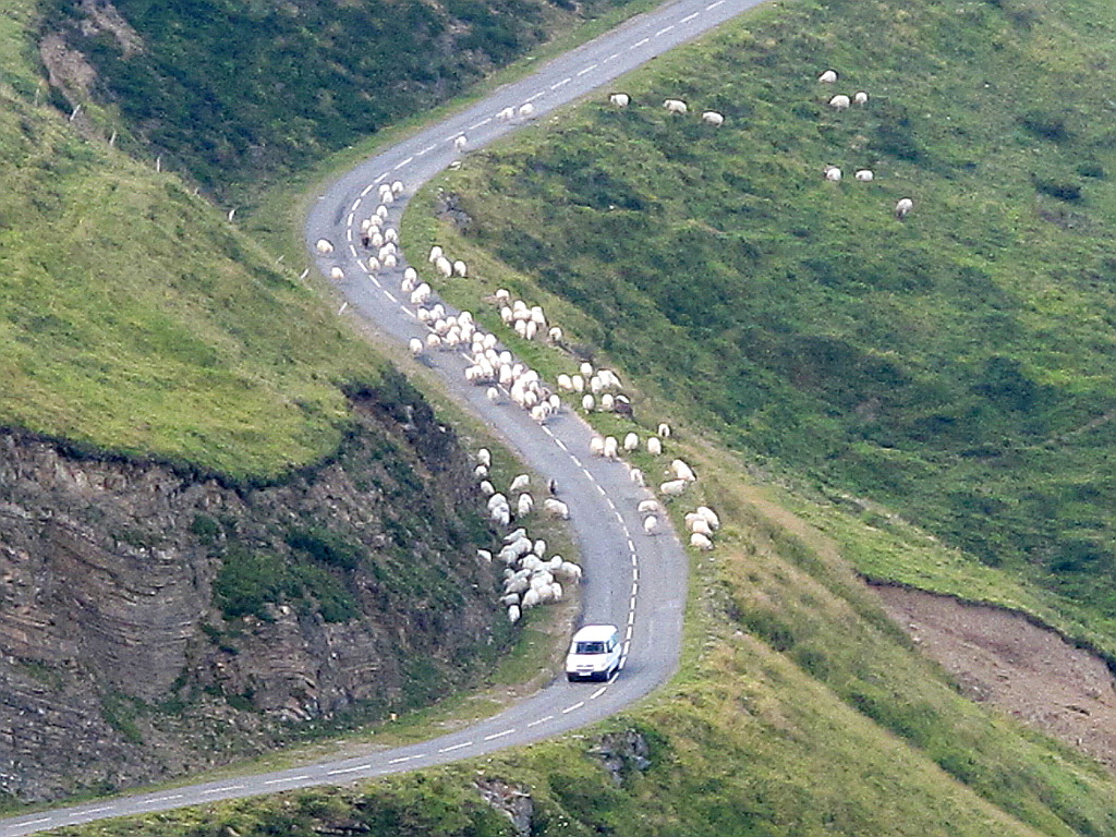 Der Puerto de Larrau(i) ist für mich einer der schönsten Pässe in den westlichen Pyrenäen. Auf der Nordseite konnte ich von oben gut beobachten, wie weiter unten ein Auto auf diese Schafsherde zufuhr, die die Straße in Beschlag genommen hatte. Ich dachte mir noch, wie lange das wohl dauern wird, bis der (und später ich selbst) da durch sind, aber das ging alles fix über die Bühne.