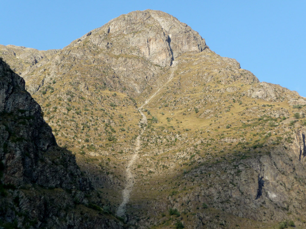 Im mittleren Teil der Westrampe geht es unter anderem durch die Schlucht Combe de Malaval, in die viele Wasserfälle fließen. Auch wenn auf einer Seite der Schlucht das Wasser durch alle Ritzen zu fallen scheint, kann auf der anderen Seite ein solch trockener Pfad zu finden sein.