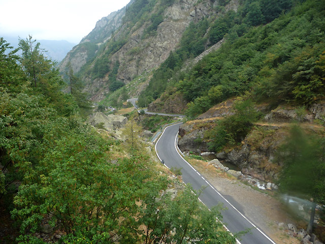 Blick zurück auf die schmale Straße des Mittelteils. Aufgenommen wurde das Bild aus einer von mehreren Kehren heraus, in denen sich gerade der Verkehr staute. Für den Fleck rechts unten ist ein Regentropfen verantwortlich.