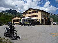 Auf der Passhöhe steht ein großes Hotel mit großem Parkplatz und Außenterasse.