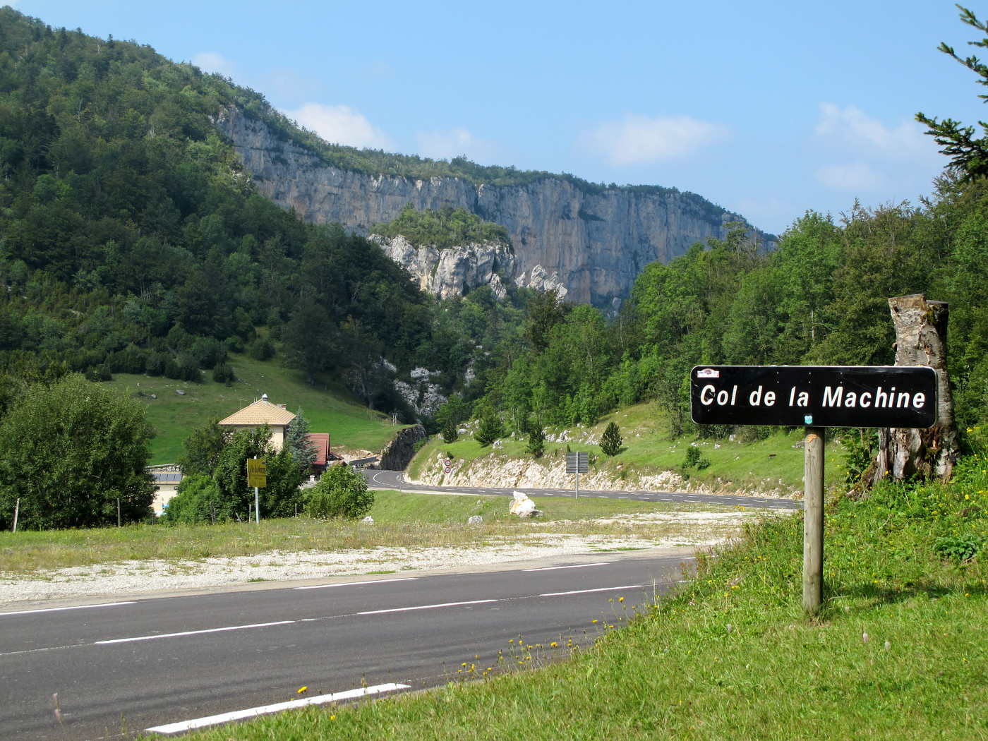 Der Blick geht von der Passhöhe des Machine nach Norden. Im Hintergrund ist ein Restaurant zu erkennen. Gleich danach kommt eine Rechtskurve, und schon hat man die Combe Laval in voller Pracht vor der Nase.