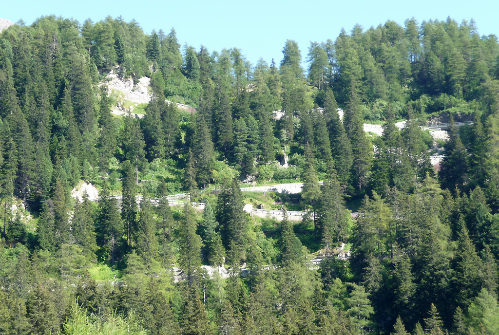 Kommt man vom Maloja und hat die letzte Kehre geschafft, kann man von unten einen Blick in den Abschnitt mit den vielen Kehren werfen. Dort ist auch wieder mehr Platz neben der Straße.