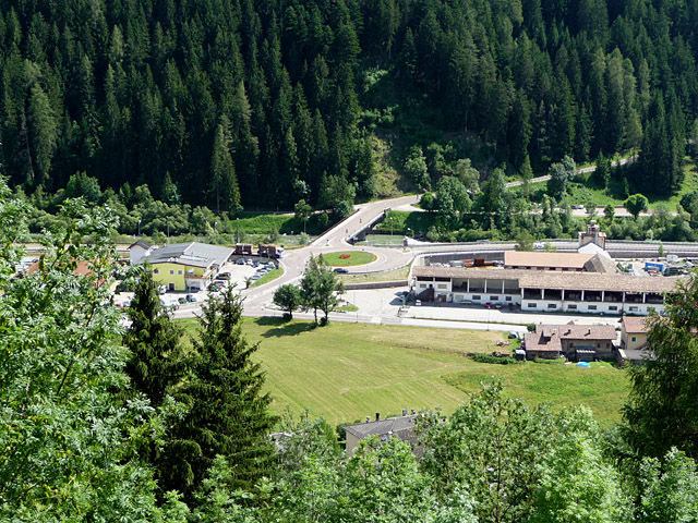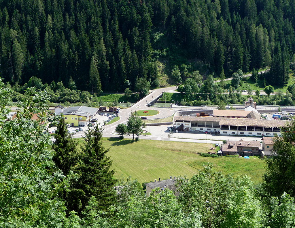 Blick von oben auf den Kreisverkehr im Tal. Die nach oben rechts abzweigende Straße gehört zur Nordrampe des Manghen, links gehts nach Predazzo und weiter hinein in den zentralen Teil der Dolomiten.