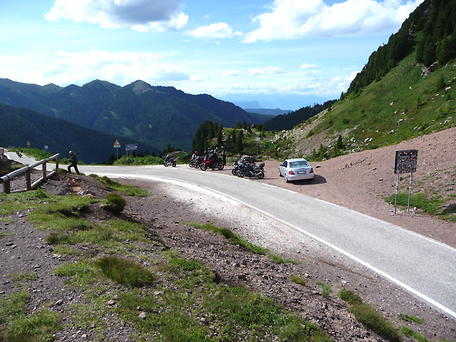 Ausschnitt des großen Panoramafotos, aufgenommen im Jahr 2010. Links steht das Pass-Gipfelkreuz, hinter den parkenden Autos befindet sich die Hütte, nach links geht es zur Nordrampe.