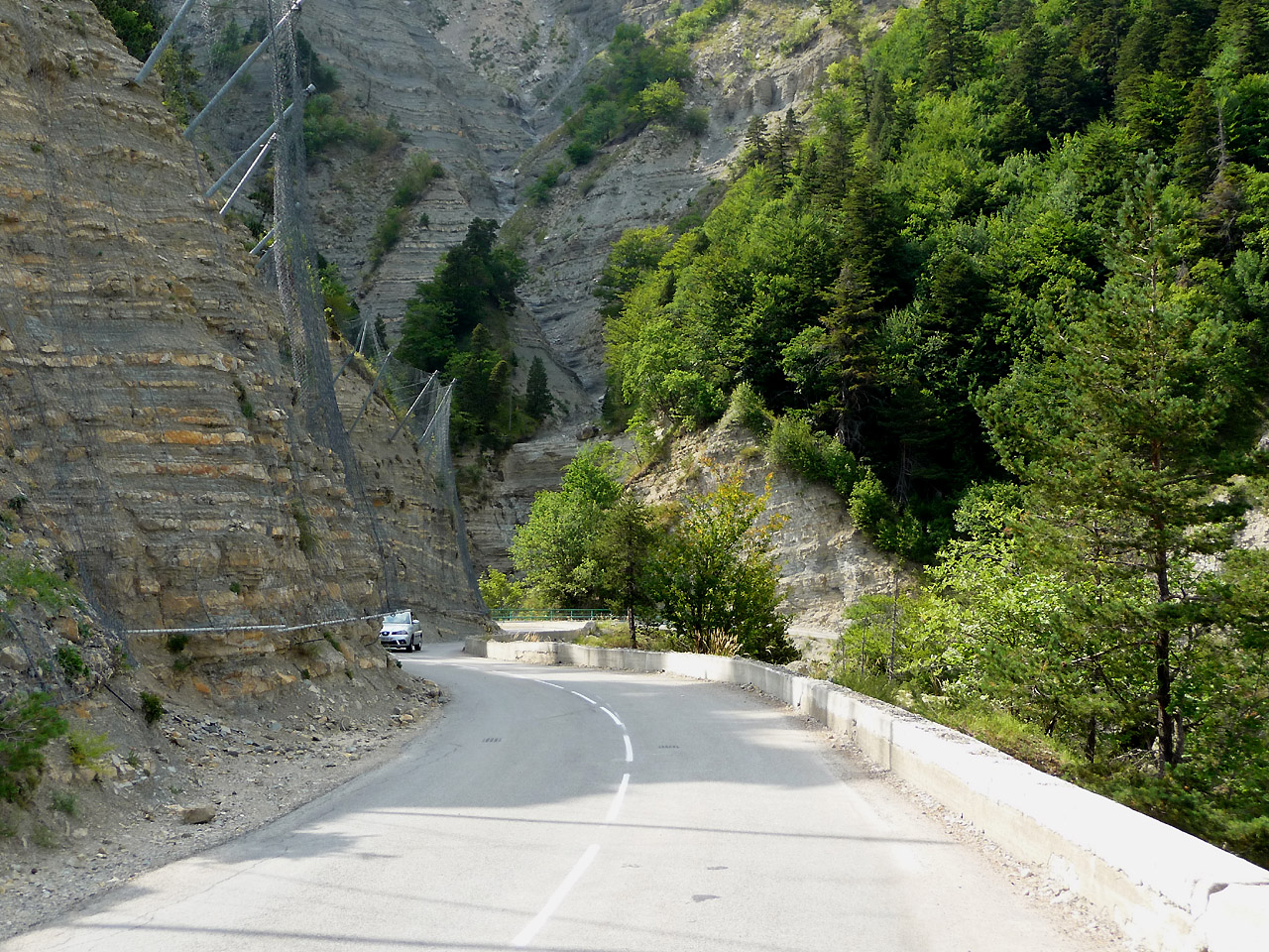 Schutzgitter am felsigen Berghang sollen herunterfallende Stein auffangen. Die Straßenführung in diesem Bereich besteht fast nur aus Kurven, die herrlich zu fahren sind.