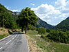 Die Südrampe des Col de Menée beginnt mit einer baumumringten Allee und wenig Steigung, deren Straßenbelag von Wellen und Flicken geprägt ist. Die Landschaft ist dicht bewachsen, grüne Bäume wo man nur hinschaut.