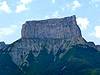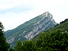 Immer wieder ist die Landschaft durch die sich langsam lichtenden Baumreihen sichtbar. Und die ist nicht ohne, in so manchem Teilstück hat man Sicht auf die umliegenden Berge. Es sind zwar keine außergewöhnlich hohen Berge, interessant ist vielmehr deren markante Form. Besonders aufgefallen sind mir eine tafelberg-ähnliche Erhebung, und eine die aus 45 Grad geneigten Gesteinsformationen besteht und wie eine Sprungschanze in der Gegend steht. Beide sind auf der Nordrampe kilometerlang zu sehen. Man fährt die Rampe hinunter, und ständig hat man einen Anblick wie den im Bild zu sehenden vor der Nase. Auf den letzten Metern fährt man dichter an ihnen vorbei, kann sie aus der Nähe betrachten, bevor im Ort La Gare die Talstation des Col de Menée erreicht ist.