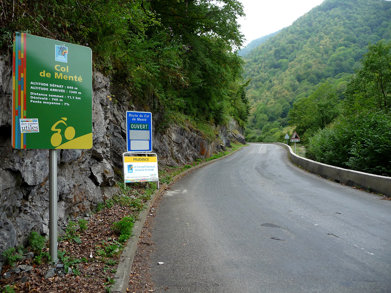 Die Einfahrt zum Col de Menté, fotografiert an der Kreuzung, die Richtung Osten (im Rücken des Betrachters) auf den nächsten Pass führt, den Col de Portet d'Aspet(i). Rechts außerhalb des Bildes geht eine kleinen Brücke über den Fluß Ger.