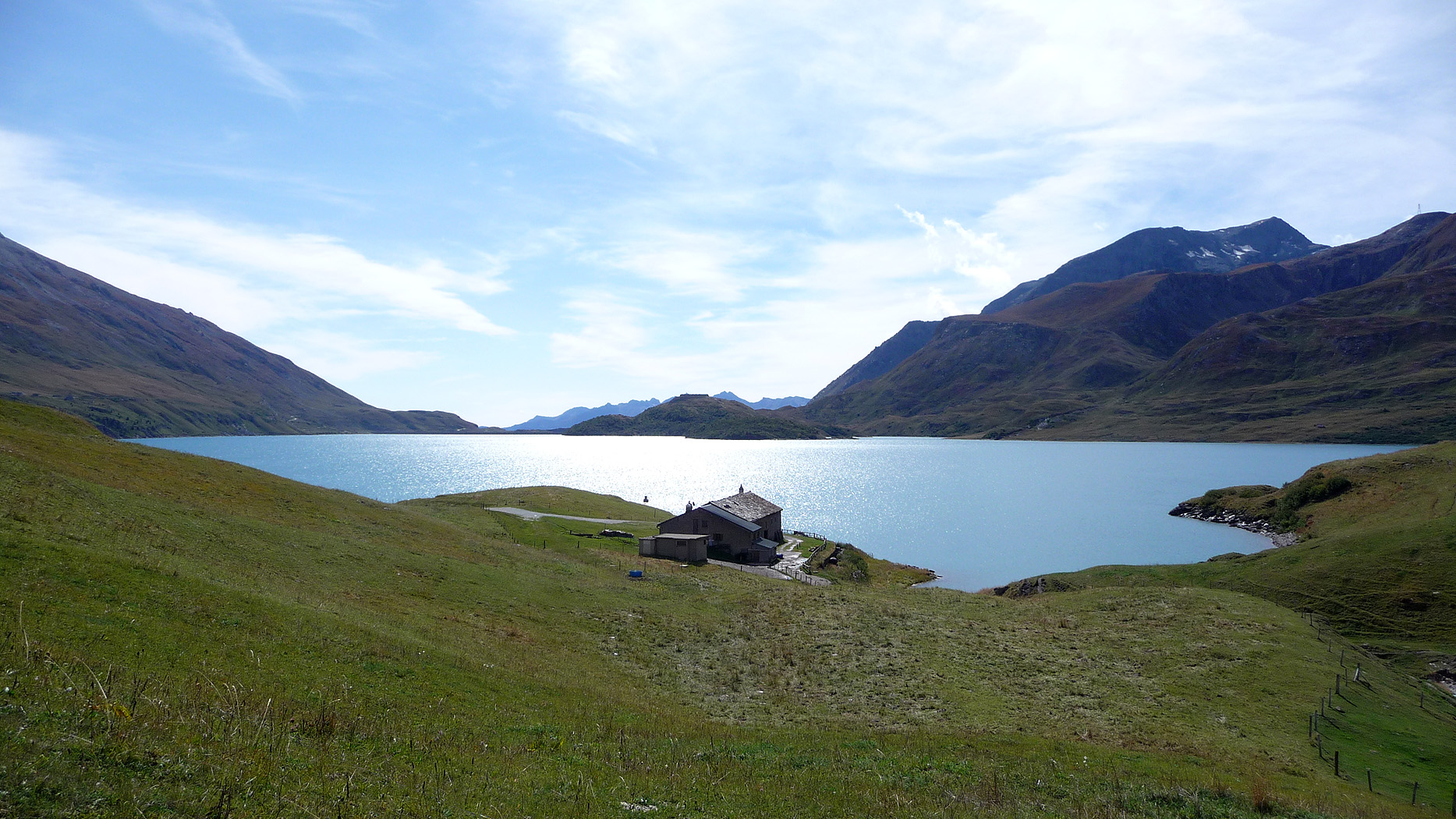 Mein Lieblingsfoto des Lac du Mont Cenis. Der Blick geht recht genau nach Süden, mitten im Bild (hinter dem Haus) ist die Halbinsel zu erkennen, die weit in den See hineinragt. Das große Panorama-Foto wurde rechts von der Halbinsel erstellt. Die Mont Cenis(i)-Passhöhe liegt etwa 2 Kilometer links außerhalb des Bildes.