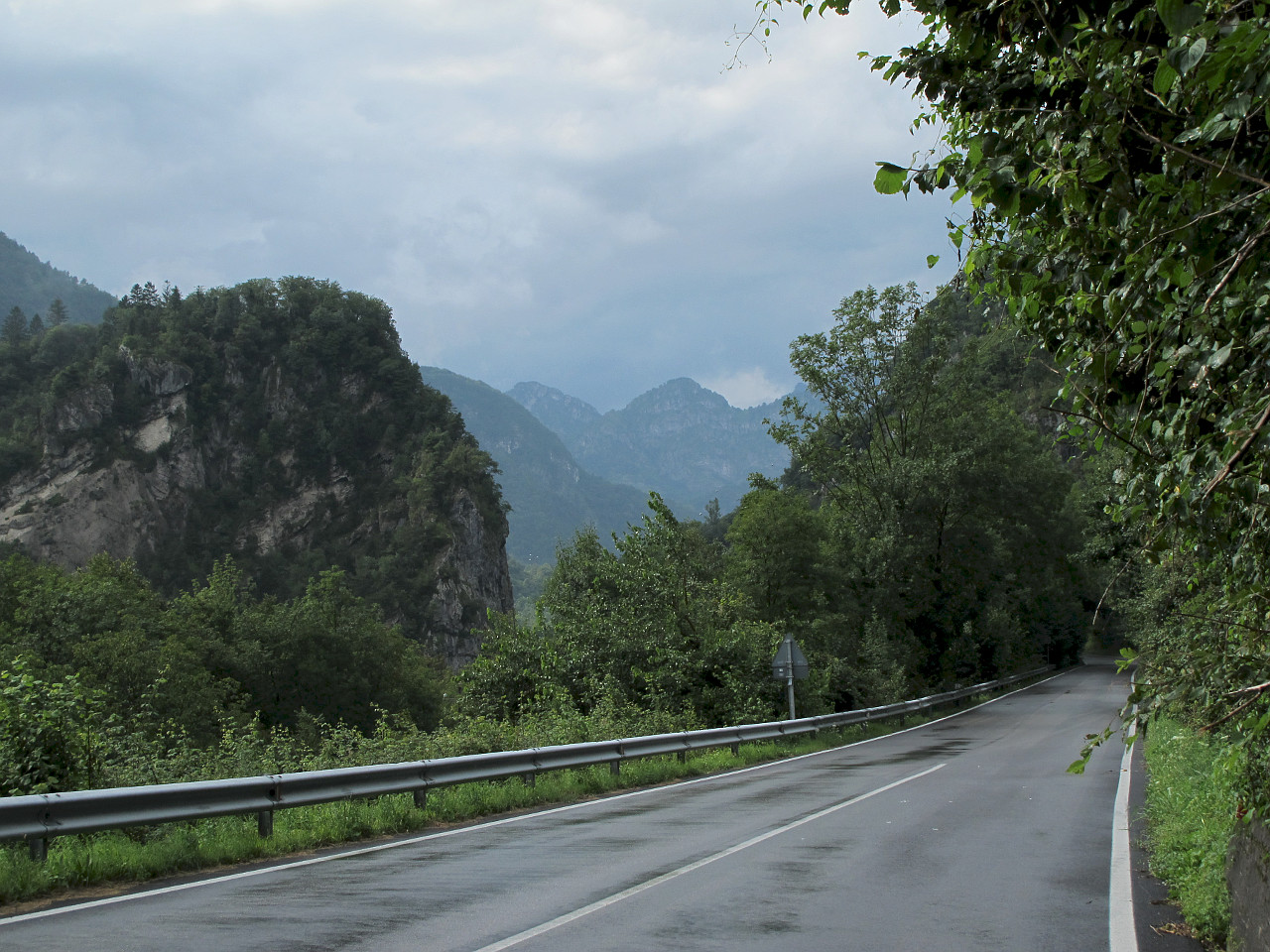 Südlich beginnt die Fahrt im Flachland bei Meduno, geht dann auf 2 normalbreiten Spuren hinein in die dicht-grün bewachsene Bergwelt. In meinem Fall regnete es, ich suchte eine Unterkunft und am nächsten Tag war das Wetter in Ordnung.