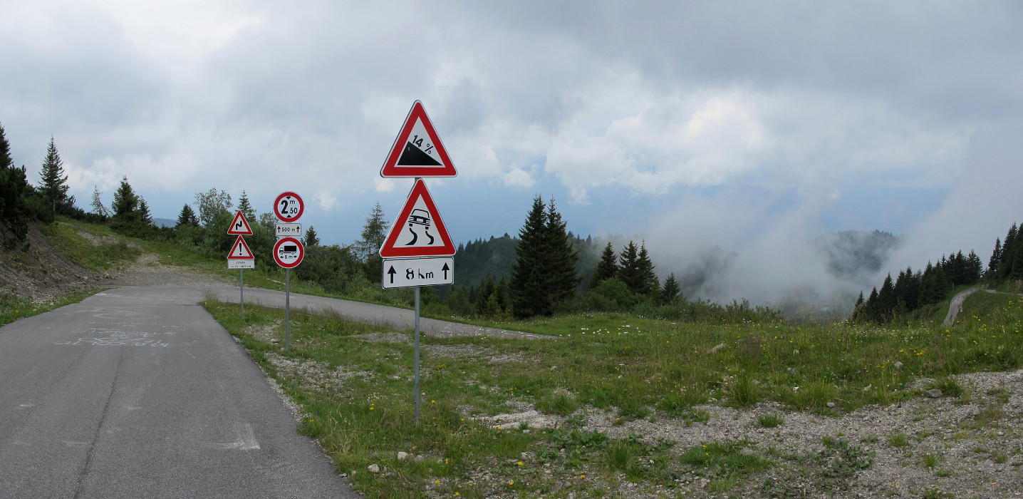 Kleiner Schilderwald auf den ersten Metern der Westrampe, von der Passhöhe aus betrachtet.