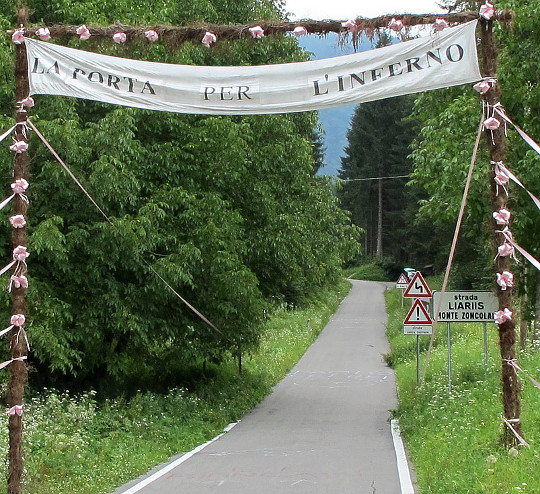 La porta per Inferno", na wie einladend. Das (eventuell nur im Jahr 2011 präsente) Eingangsportal macht Sinn, denn die Steigung auf der 10 Kilometer langen Westrampe ist bestialisch, muss sie denn mit eigener Muskelkraft bewältigt werden.