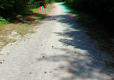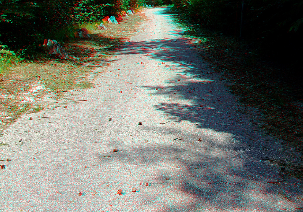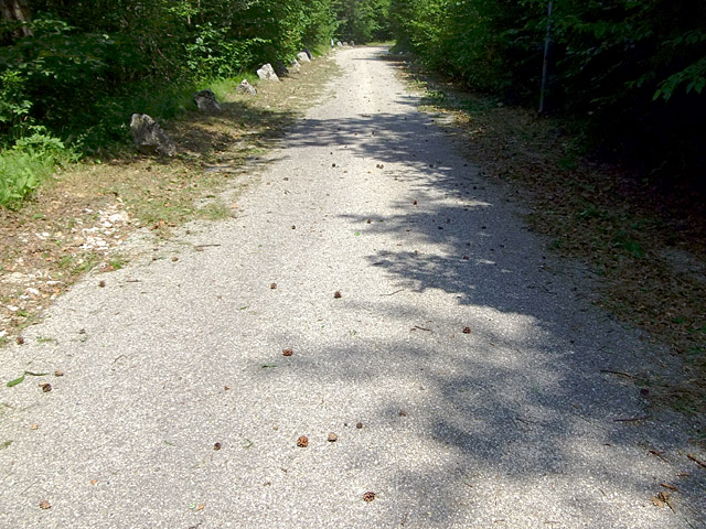 Auf mehreren 100 Metern lagen Tannenzapfen auf der Straße, an manchen Stellen weit mehr als in diesem Foto zu sehen. Ich habe schön dafür gesorgt, das ich um die Teile herumkurve, denn von denen wollte ich keinen unter meinem Vorderreifen haben.