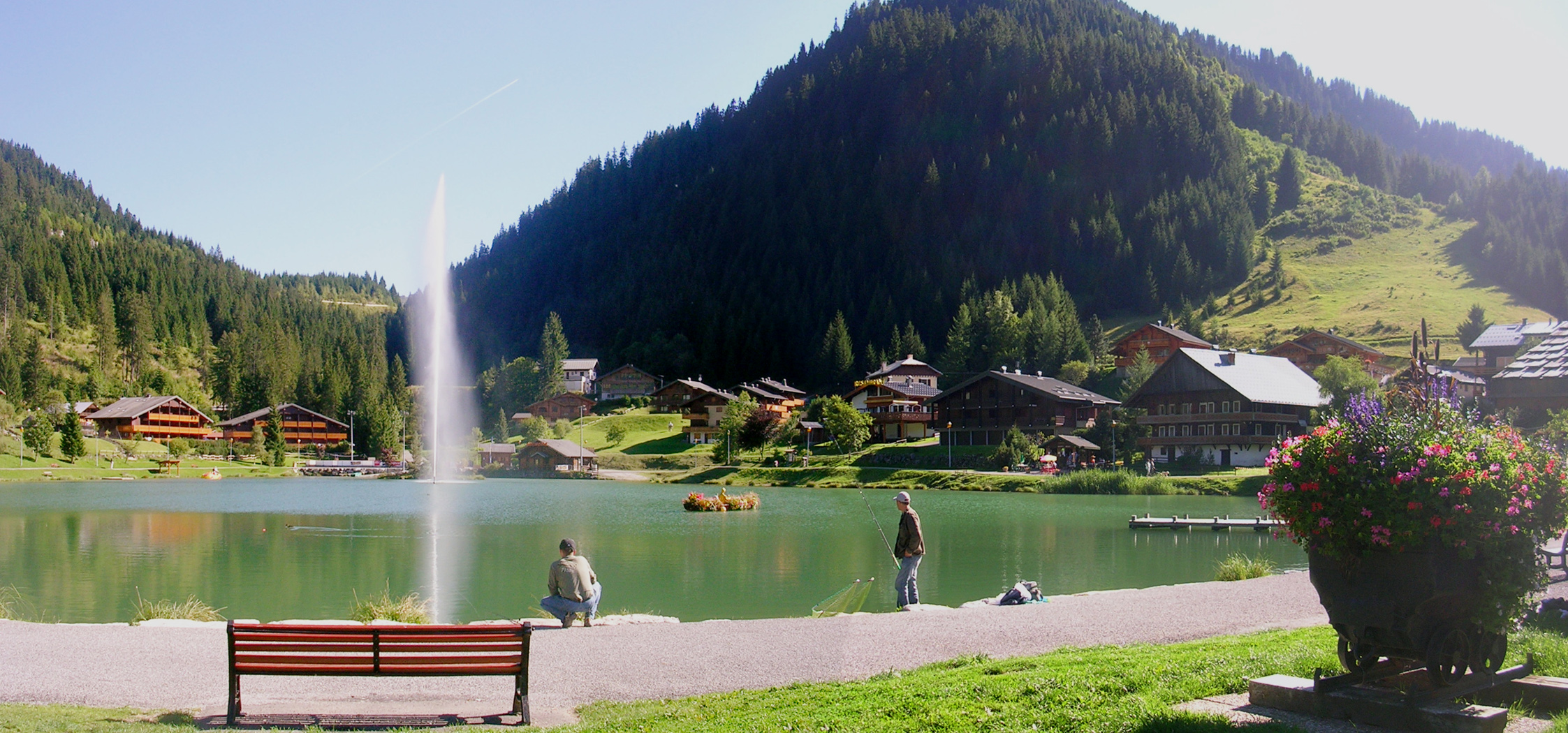 Der herrlich anzuschauende See im Örtchen Châtel kurz unterhalb der Passhöhe des Pas de Morgins. Diese liegt links neben der Spitze des Springbrunnens und ist vom See aus nur wenige Fahrminuten entfernt.