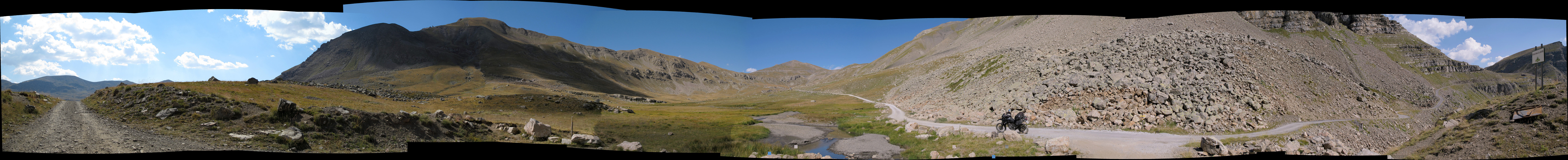 Links geht es auf die schwer geschotterte Westrampe, in der Mitte auf die Nordrampe, rechts ist die Passhöhe des Moutière zu erkennen. Das Pano erhält ein paar Fehler, Resultat der enormen Bildbreite, meinem verfügbaren Speicher, und dem Bildbearbeitungsprogramm GIMP, das mit dem fetten Roh-Bild wohl überfordert war.