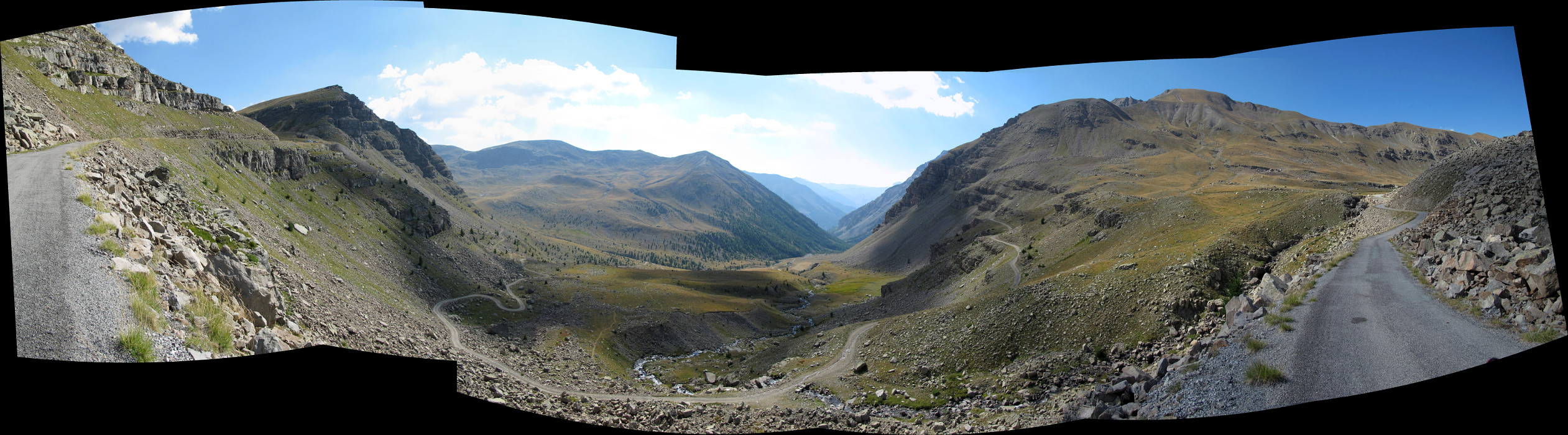 Besten Blick auf die Westrampe und deren Taleinschnitt hat man von den obersten Metern der Nordrampe. Links ist die Passhöhe zu erkennen, rechts geht es zur Kreuzung und weiter nach Norden zum Bonette(i), in der Bildmitte liegt irgendwo die Nordrampe des Cayolle(i).
