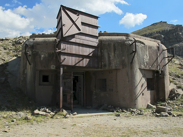 Den Bunker auf der Passhöhe sollte man auf jedenfall erkunden. Wenigstens hineingehen und die Enge kurze fühlen. Eingang, drei Schießscharten, Null Platz, eine Treppe weiter runter in die Dunkelheit.