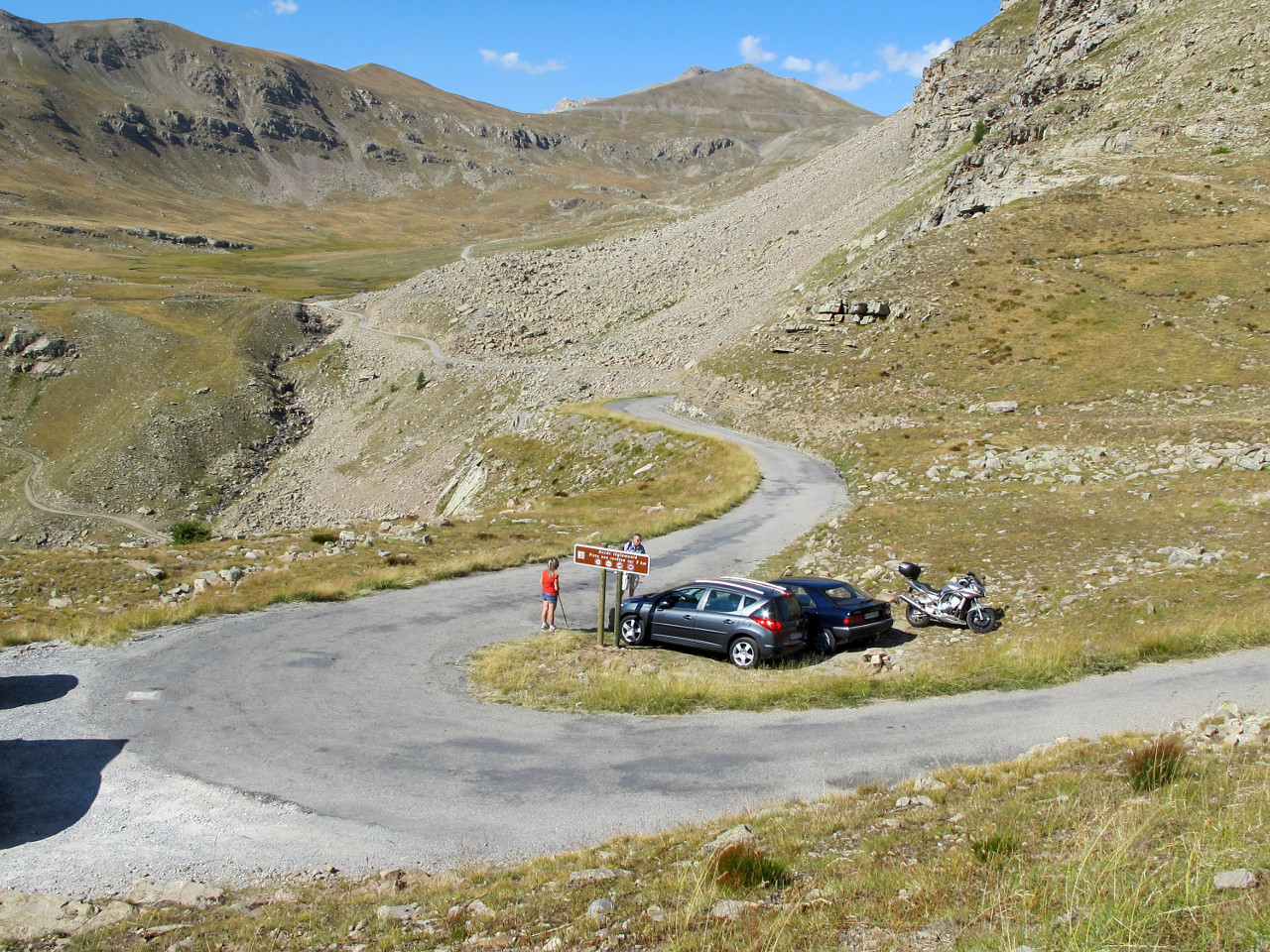 Links ist einer der Bunker-Eingänge zu finden, geradeaus geht es auf die einfach geschotterte Nordrampe, links am Bildrand ist ein kurzes Stück der um einiges schwereren Westrampe zu sehen. Der Hügel in der Mitte des oberen Bildrandes ist NICHT der Cime de la Bonette.