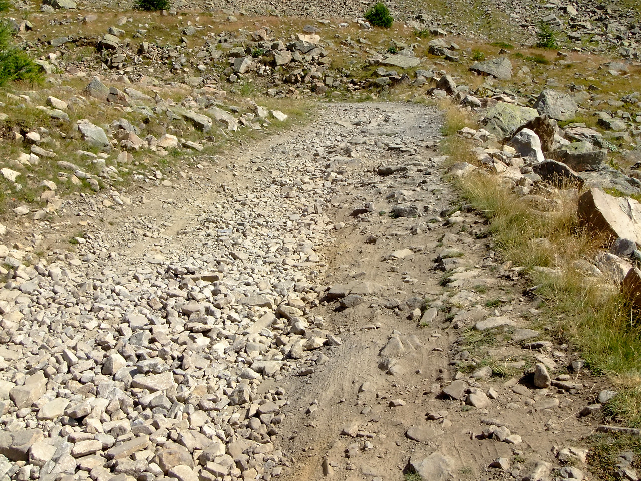 Mit der schwerste Abschnitt auf der Westrampe, etwa 1-2 Kilometer vor Erreichen der Kreuzung. Links rutscht der Reifen weg, rechts ist es sehr hubbelig. Mit vollem Satz Gepäck war das anstrengender als von mir eingeplant.