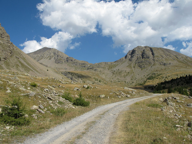 Der Hügel links ist der Cime de la Bonette, die Passhöhe des Moutière lässt der Abraumhügel am Bergrand in der Bildmitte erahnen. Dafür muss jedoch die höchste Auflösung des Bildes bemüht werden, die ganz am rechten Bildrand weitere Bunkeranlagen zeigt, die per Fußweg zu erreichen sind.