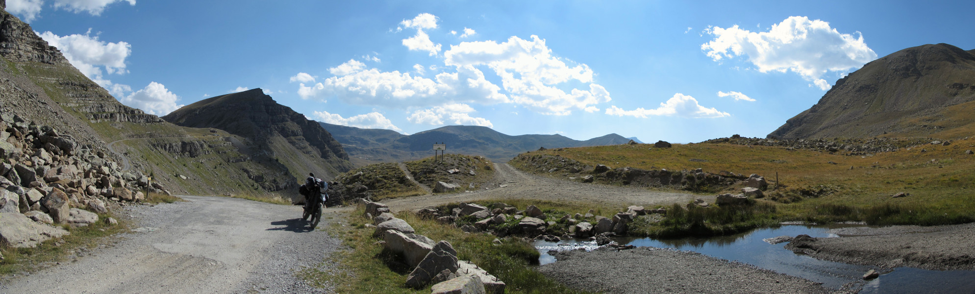 An dieser Kreuzung auf der Nordrampe treffen Himmel und Hölle aufeinander. Links sind die letzten/ersten Meter Asphalt zu sehen, in Verlängerung dazu der Bunker auf der Passhöhe. Rechts geht es auf die schwierige Westrampe, im Rücken des Betrachters auf die kurze aber einfach geschotterte Nordrampe und weiter zum Bonette(i).