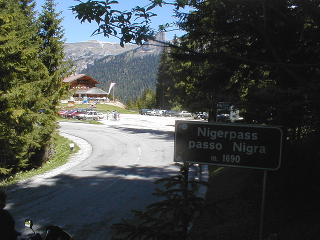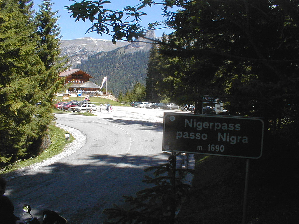 Im Bild das südliche Passschild. Im hellen Bereich ist das Nigerhaus zu erkennen, das auf der Passhöhe Verpflegung und gute Aussicht auf das Bergmassiv Rosengarten anbietet. Die Passhöhe wird auf einer großen Kehre überquert, die zwischen dem Restaurant und dem Parkplatz durchführt.