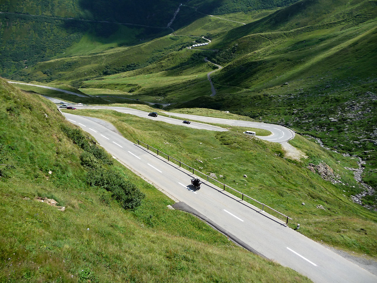 Im oberen Teil ist die Landschaft kahl und grün, Die Straße hat Kurven und Kehren zu bieten.