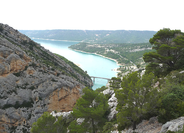 Der Ausgang der Verdon-Schlucht, mit sattem Weitwinkel von der Ostrampe des Col de l'Olivier aufgenommen. Der See ist der Lac de Sainte Croix, der am südlichen Ende (links) gestaut ist.