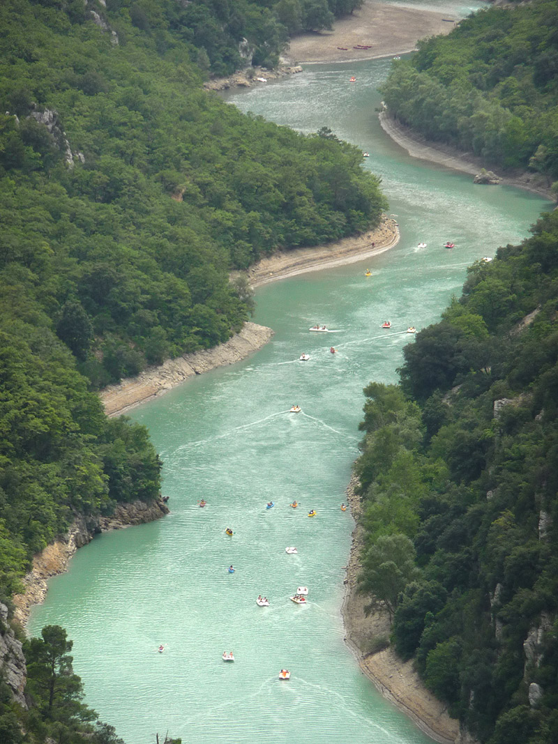Massen an Tretbooten in den letzten Ausläufern der Verdon-Schlucht. Aufgenommen wurde das Bild von der Ostseite des Col de l'Olivier, kurz bevor man die höchste Stelle passiert.