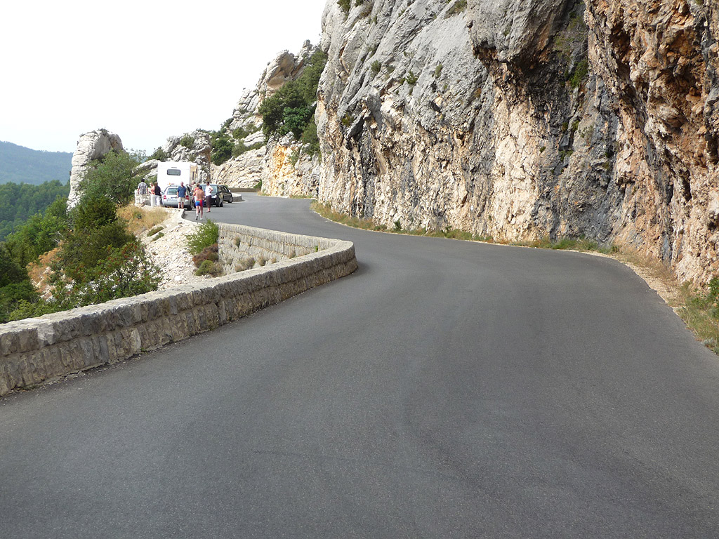 Ungefähr hier müsste irgendwo die höchste Stelle des Col de l'Olivier sein. Links außerhalb des Bildes liegt der See Lac de Sainte Croix. Die sich über den Ausgang spannende Brücke dürfte sich bei einem Blick nach links ziemlich genau unterhalb dieser Stelle befinden.