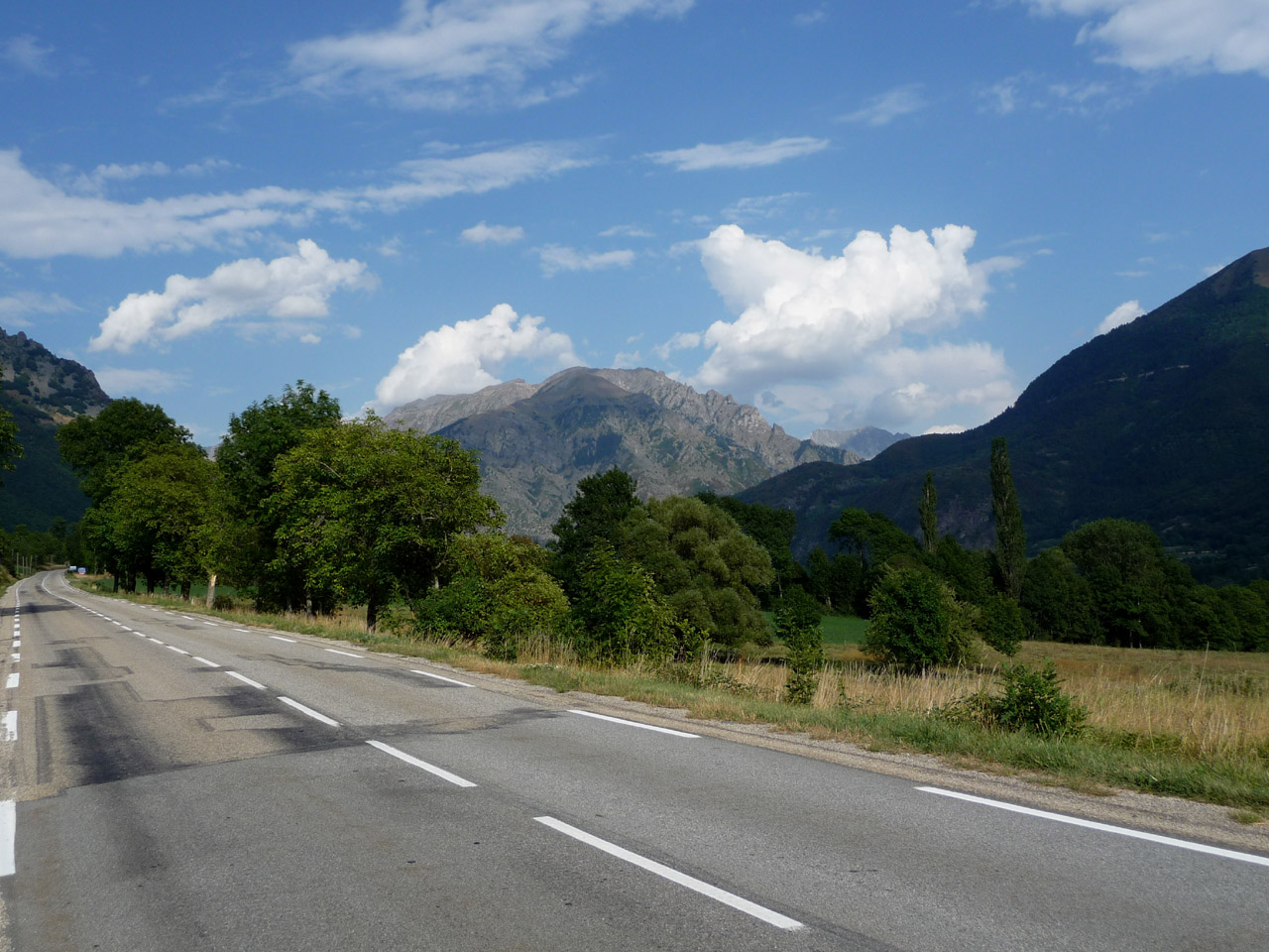 Unter Teil der Ornon-Südrampe führt durch ein weites Tal, das auf beiden Seiten von hohen Bergen abgegrenzt wird.