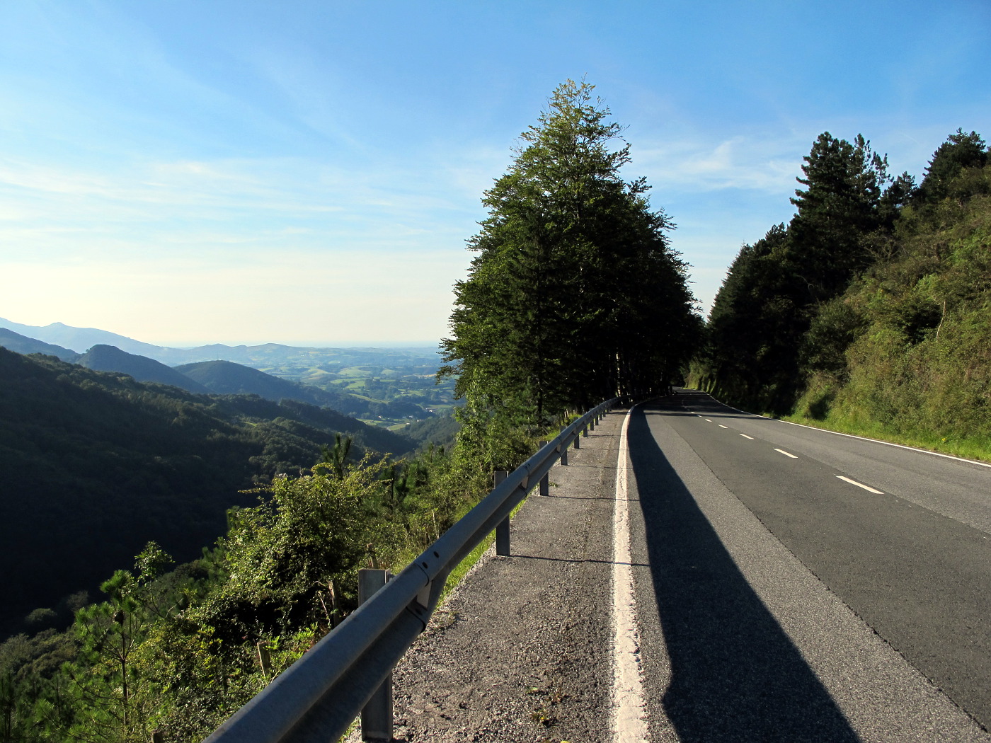 Im Bild ist es nicht sonderlich gut zu erkennen, aber der blaßblaue Streifen links der Bildmitte gleich neben den Bäumen ist der Atlantik. Fährt man die Nordrampe bergab, taucht diese Ansicht wenige Fahrminuten hinter der Passhöhe auf.