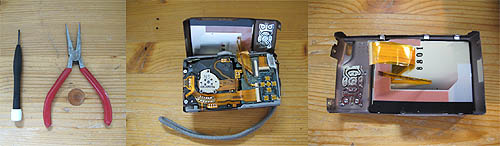 Nun gut, also ging es an die Arbeit, wie im Video auf Youtube gezeigt. Zuerst muss die Kiste aufgeschraubt und zwei Flachbandkabel abgezogen werden, bis man die komplette Rückseite der Kamera lose vor sich liegen hat. Dafür benötigt man Mini-Werkzeug, wobei sich herausstellte, das der kleineste Kreuzschlitzschrauber in meinem Sortiment mit einer Spitze von weniger als 2mm fast schon zu groß war.