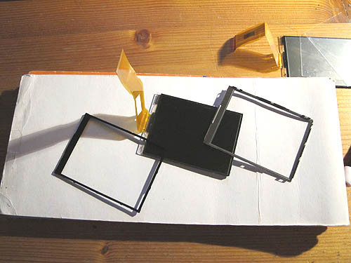 ... und mit dem neuen wieder zusammenpussementieren. Ging alles, und scheinbar auch ohne etwas kaputt zu machen. Nun noch das Display zwischen Hintergrundbeleuchtung und Kameraabdeckung bauen, die beiden Flachbandkabel einschieben (im Hintergrund das fürs Display, das schmale im Vordergrund für die Beleuchtung) ...