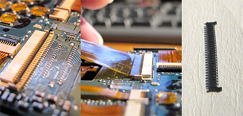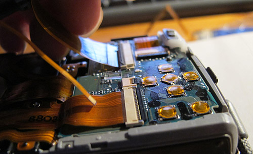 Tja, irgendwie gings dann. Das richtig hohe Zufriedenheitsgefühl fehlt jedoch, da die Flachkabel-Steckverbindung ohne die schwarze Fixierungs-Klemme nicht gerade die stabilste ist. Auch die verlorengegangenen Gehäuse-Schrauben habe ich wiedergefunden, und selbst nachdem die Kamera wieder komplett zusammengeschraubt war, funktionierte noch alles.