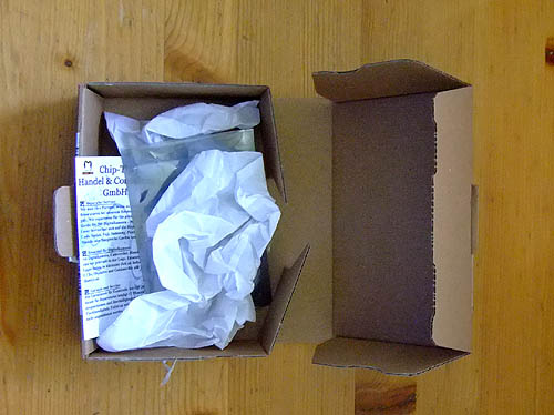 Ein paar Tage später kam das Paket an. Das Display war recht lasch verpackt, man kann es zwischen den Papierknüddeln in silberer Folie entdecken.